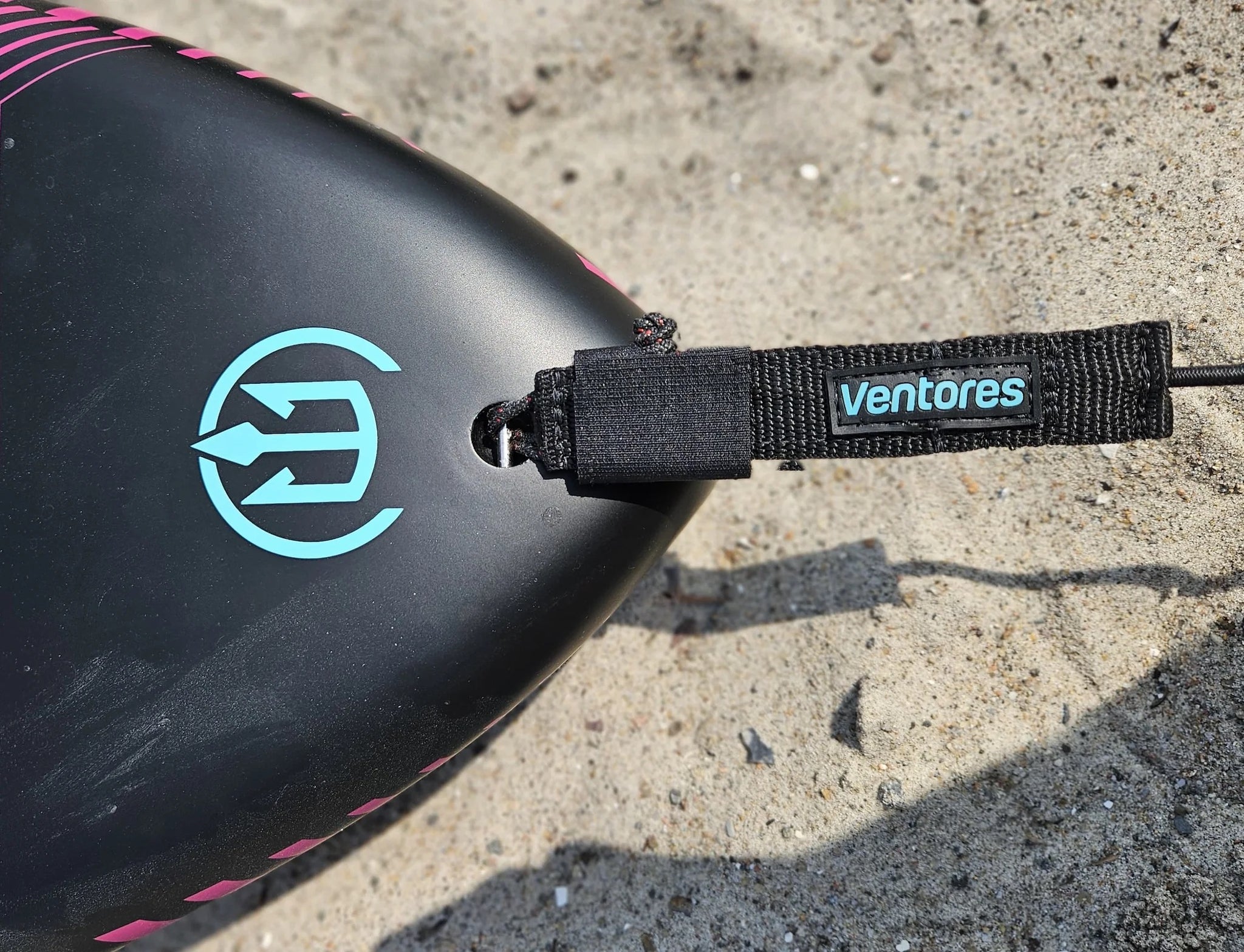 The Ventores Foil Board Leash replaces traditional load-bearing Velcro layers in the rail guard with a streamlined, lightweight, and ultra-strong SoftLoop system. In this design, the string cord integrated in the railguard and is locked with a knot, reducing material use while eliminating the risk of Velcro wear and accidental release.