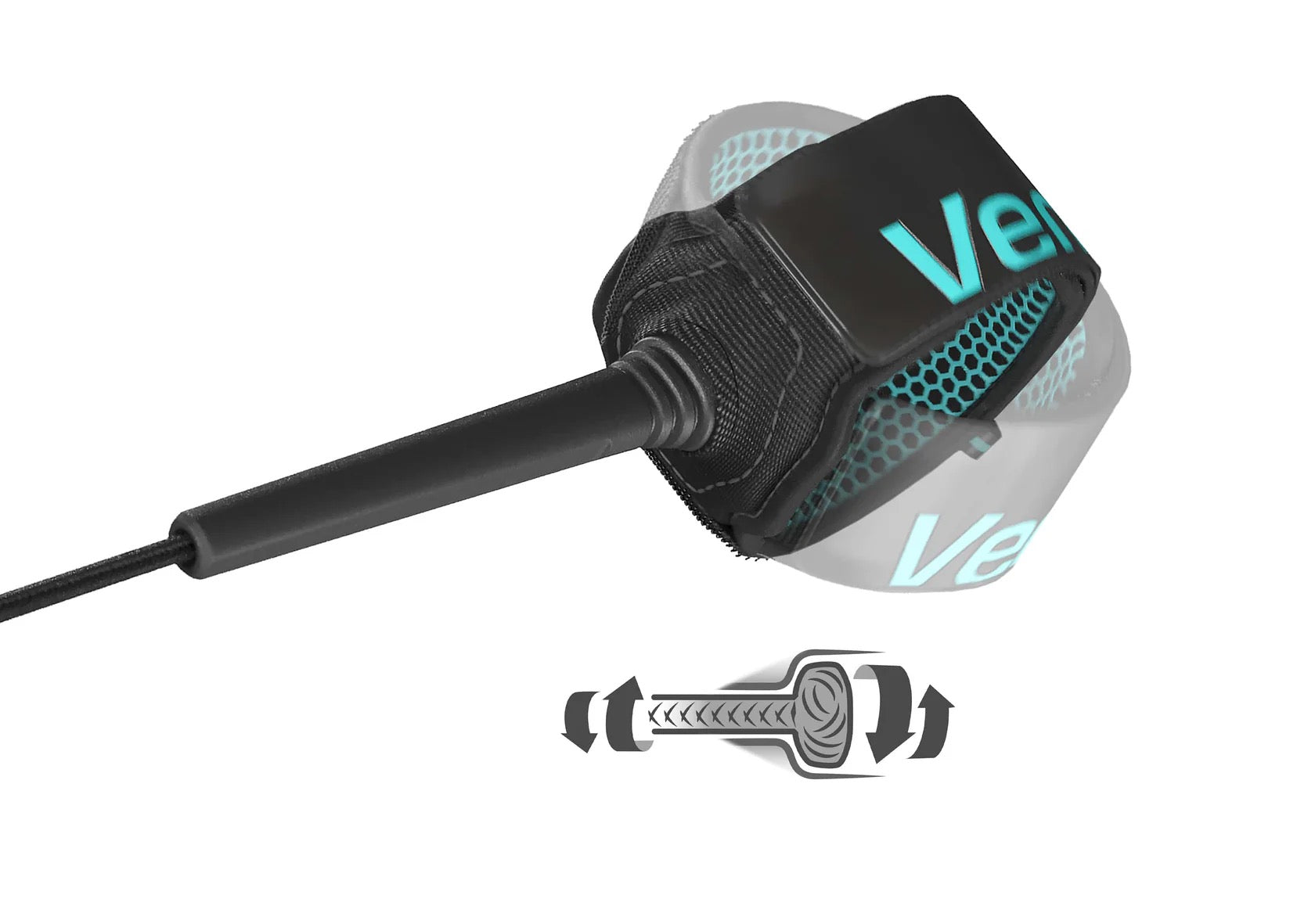 The newly developed patented pending Ventores SoftSwivel technology replaces the two standard metal swivels with high-strength knots made of Dyneema® fibers that rotate on low-friction surfaces made of special polyamide. The swivel knot in the ankle strap is made from the end piece of the Dyneema cover of the leash cord, while the swivel on the rail guard is made from a special Dyneema line that also creates a connection to the rail guard. In addition to the two metal swivels that are vulnerable to corrosion, the SoftSwivels technology also eliminates the need for gluing, plug connections and screw connections.